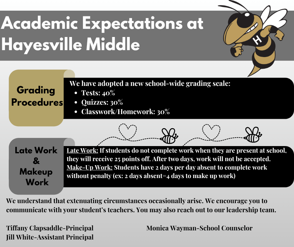 At Hayesville Middle School, we strive to create consistency in expectations in classrooms. In the 2024-2025 school year, our faculty voted on the grading policies they felt would promote student success and accountability. Those expectations are outlined below.
